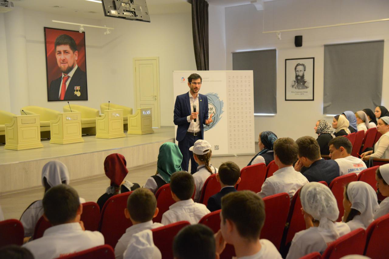 Видеозаписи встреч используются на классных часах с игровыми элементами. Благодаря проекту "Классные встречи" школьники учатся формировать ценностные ориентиры через формат доверительного общения с состоявшимися людьми, получившими общественное признание. Сегодня, 16 сентября, по инициативе председателя регионального отделения Российского движения школьников Я.З. Агаевой, ответственного секретаря общественной организации "Национальная родительская ассоциация" М.М. Зумаевой, координатора Российского движения школьников М.А. Байсарова в Министерстве образования и науки Чеченской Республики была организована встреча учащихся 55 школ региона с учителем обществознания Математической школы №1 им. Х.Х. Ибрагимова, абсолютным победителем Всероссийского конкурса "Учитель года России-2018" Алиханом Динаевым. После непродолжительной вступительной части беседа проходила в формате "вопрос - ответ". Регламент встречи был ограничен, и время пролетело так быстро и незаметно, что учащиеся еще долго не хотели отпускать гостя, продолжая задавать вопросы. Авторам наиболее интересных вопросов Алихан Динаев вручил книги "20 обычных чеченцев".