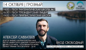 09.10.2019Активный популяризатор математики среди детей и взрослых Алексей Владимирович планирует выступить с лекциями на базе трех грозненских школ – ГБОУ «Математическая школа №1 им. Х.И. Ибрагимова», ГБОУ «Лингвистическая школа им. Ю.Д. Дешериева» и ГБОУ «Президентский лицей».