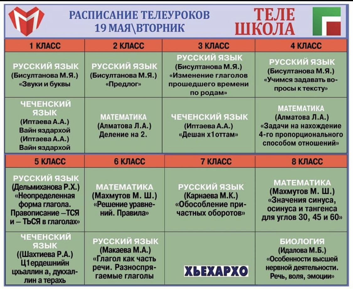 Расписание телеуроков для школьников на 19 мая. Занятия продолжительностью до 10 минут начинаются в 9.00. Отметим, что все образовательные выпуски телепроекта доступны для просмотра на сайте Министерства образования и науки ЧР по ссылке, указанной в шапке профиля @minobrnauki_95.