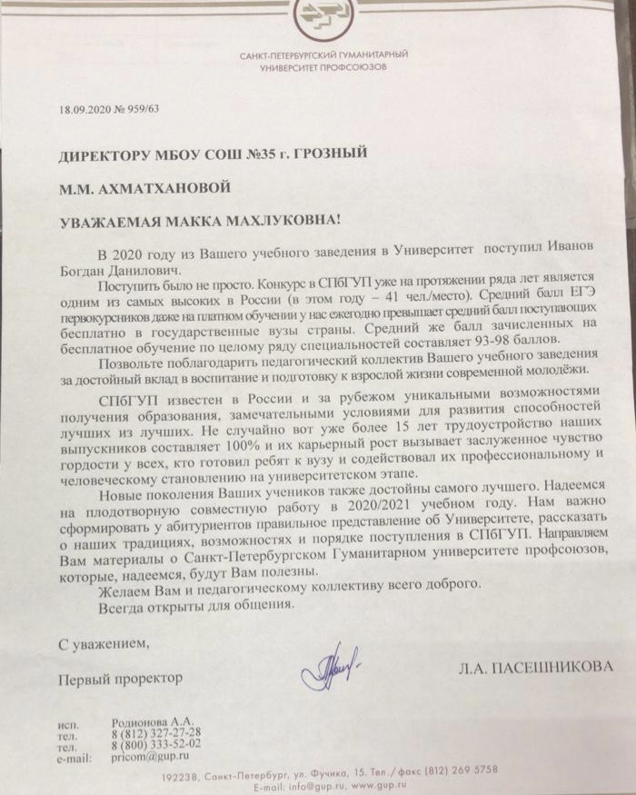 Педколлектив МБОУ « СОШ 35» г. Грозного благодарит администрацию Санкт-Петербургского гуманитарного университета профсоюзов, за высокую оценку нашего труда и надеемся на плодотворное дальнейшее сотрудничество