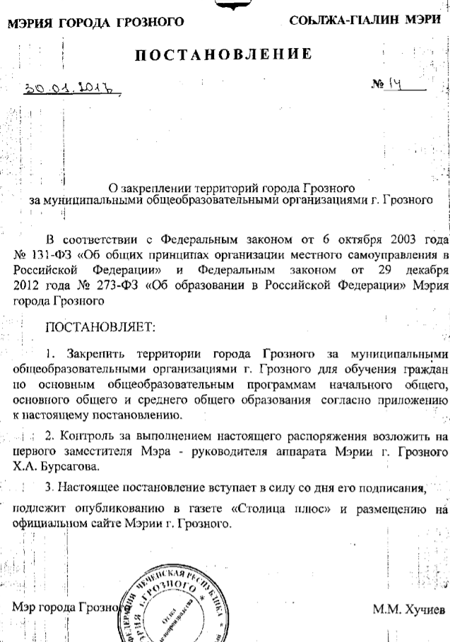 Постановление Мэрии г.Грозного №14 от 30.01.2017 г. "О закреплении территорий города Грозного за муниципальными общеобразовательными организациями г.Грозного"