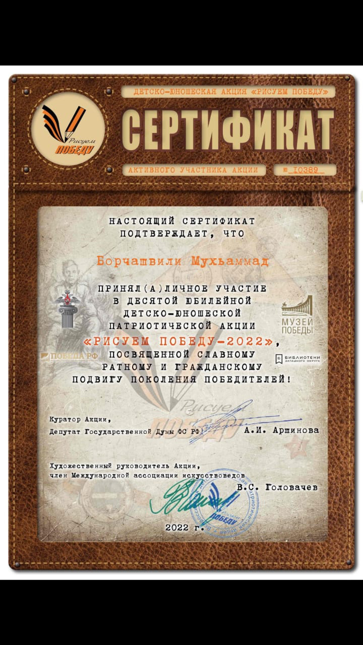 Ученик 5 «А» класса МБОУ «СОШ35» г.Грозного Борчашвили Мухьммад, принял участие в десятой юбилейной детско - юношеской патриотической акции " Рисуем победу -2022"!