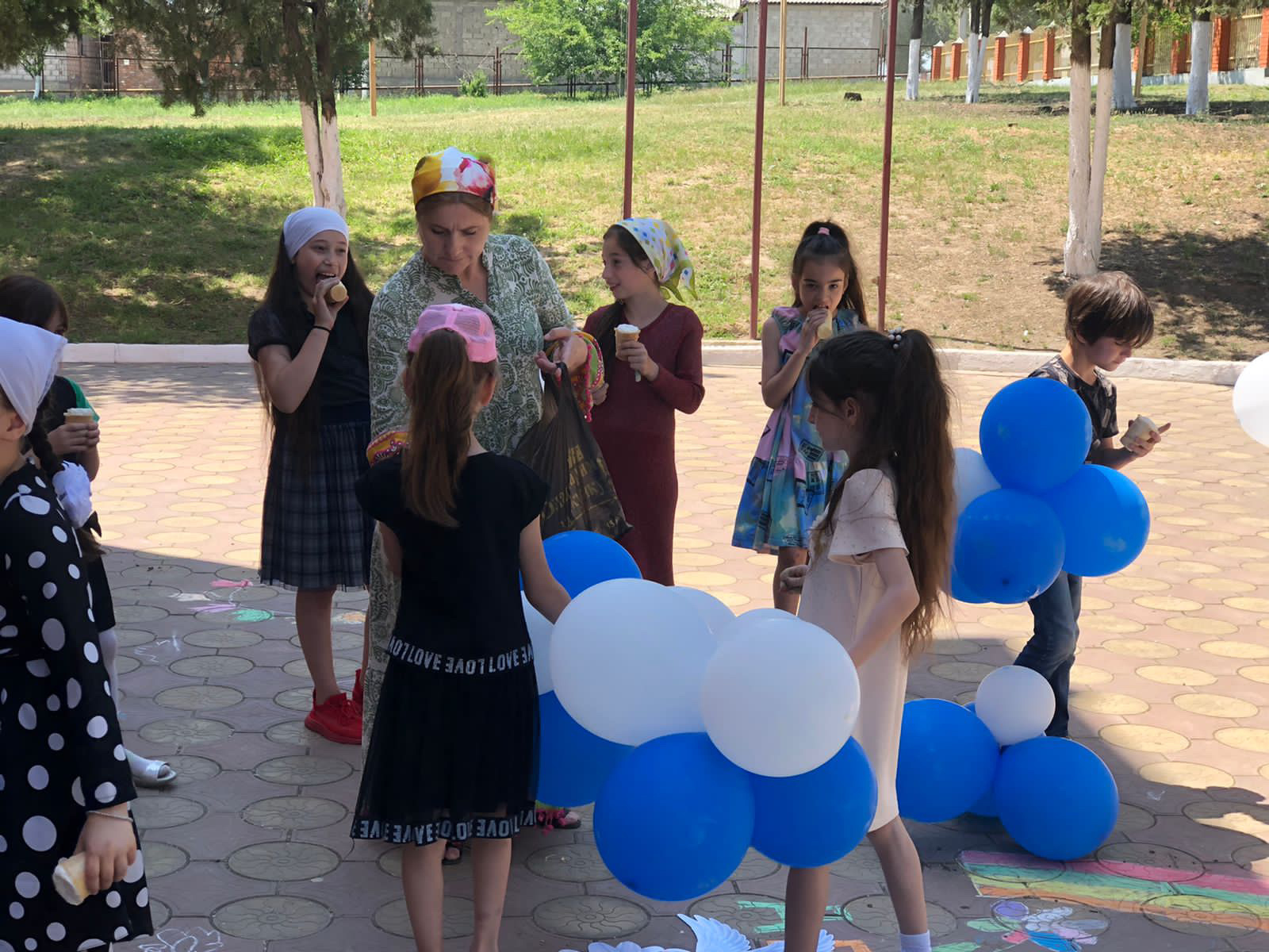 Конкурс рисунков на асфальте, спортивные игры на природе, в конце праздника все участники получили сладкие призы- мороженое!