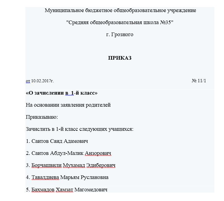 Приказ № 11/1 от 31.03.2017 о зачислении в 1 класс следующих учащихся.