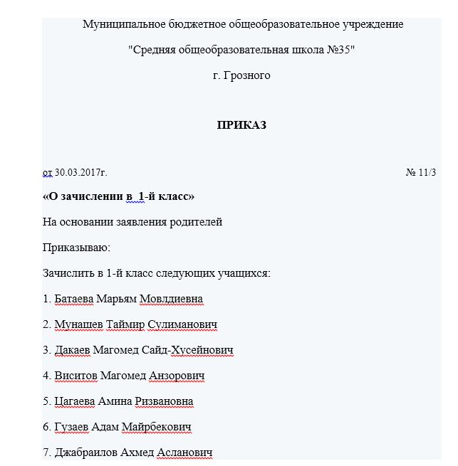 Приказ № 11/3 от 31.03.2017 о зачислении в 1 класс следующих учащихся.