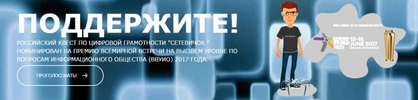 20.04.2017Российский квест по цифровой грамотности "Сетевичок" номинирован на Премию Всемирной встречи на высшем уровне по вопросам информационного общества (ВВУИО) 2017 года. Организаторы Премии Международный союз электросвязи, программа развития ООН, Юнеско и конференция ООН по торговле и развитию.Сейчас стартовало Народное голосование и все могут принять участие в нем.