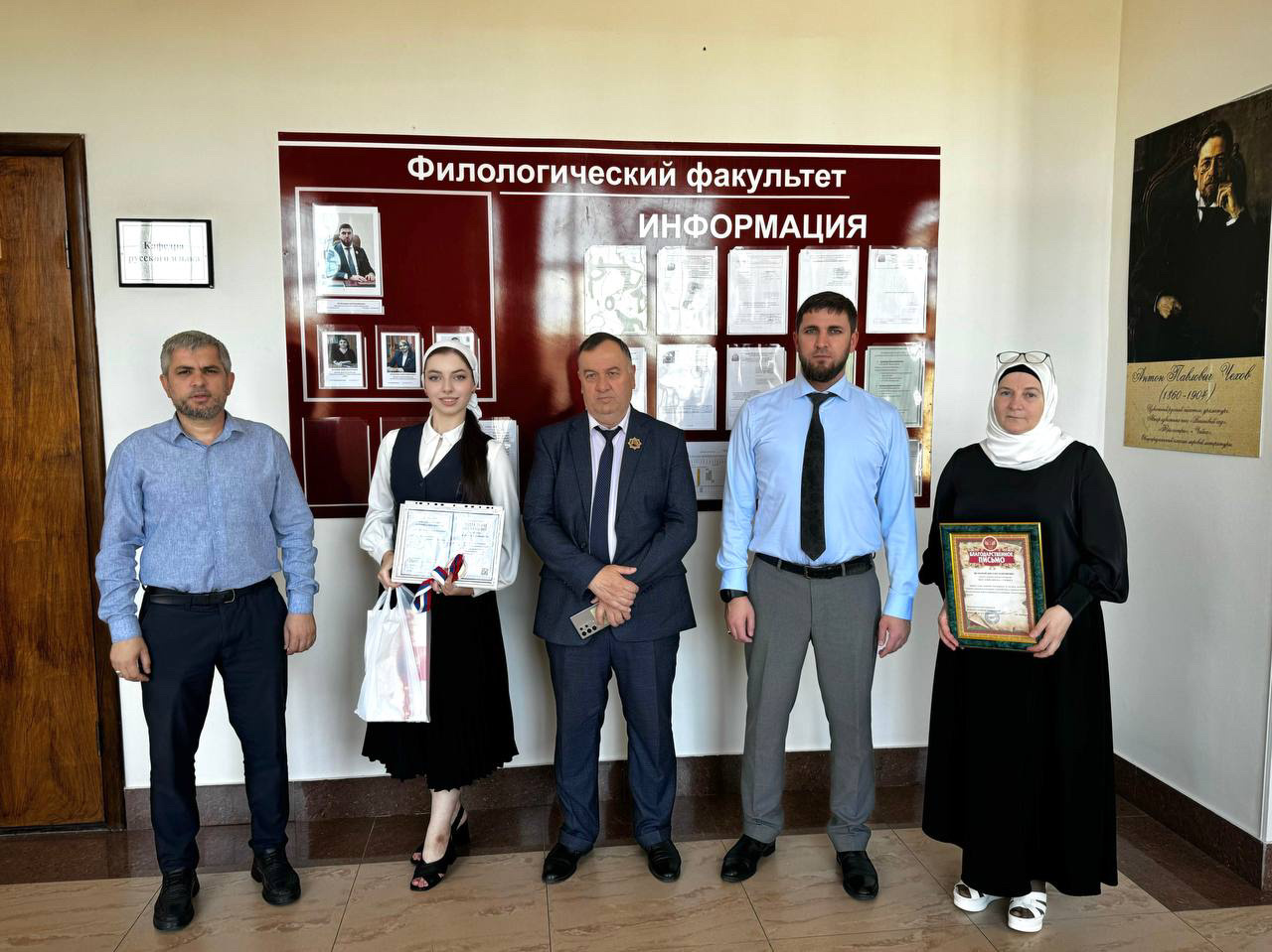 Ученица Гимназии № 5 города Грозного Амира Элембаева стала призером олимпиады по профилю «Родные языки». Декан филологического факультета ЧГУ Аюб Абубакаров наградил её дипломом III степени, медалью и ценными подарками.