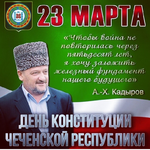 22.03.2018В этом году мы отмечаем 15 годовщину со дня принятия судьбоносного решения в жизни народа Чеченской Республики, со дня, когда на общенародном референдуме Чеченской Республике 23 марта 2003 года народ сказал «да» первой Конституции Чеченской Республики - «Мы, многонациональный народ Чеченской Республики, осознавая свою историческую ответственность за утверждение гражданского мира и согласия в Чеченской Республике, стремясь защитить права и свободы человека как высшую ценность и укрепить демократические основы общества, руководствуясь общепризнанными принципами равноправия и самоопределения народов, исходя из ответственности перед прошлым, настоящим и будущим общества и народа, свидетельствуя о своей исторической общности с Россией и ее многонациональным народом, подтверждая лучшие традиции народов Чеченской Республики и всей Российской Федерации, чтя память предков, передавших нам любовь и уважение к земле отцов, веру в добро и справедливость, провозглашаем и принимаем Конституцию Чеченской Республики.».