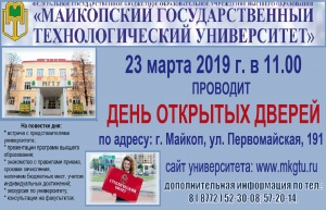 Для тех, кто хочет стать востребованным специалистом и профессионалом своего дела! 23 марта 2019 г. в 11.00 в актовом зале Майкопского государственного технологического университета пройдет ДЕНЬ ОТКРЫТЫХ ДВЕРЕЙ
